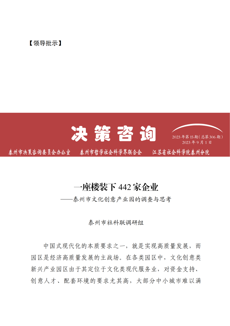 2023年《决策咨询》第15期:一座楼装下442家企业——泰州市文化创意产业园的调查与思考