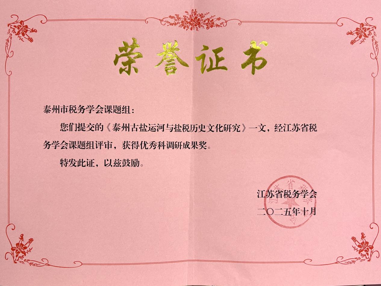 10月28日,由江苏省委宣传部、省社科联联合主办的江苏省社科界第十九届学术大会顺利召开。作为全省社科界学术研究的最高级别平台,本次大会以“聚焦社科前沿、服务发展实践”为核心宗旨,汇聚了全省各地社科领域的优秀研究成果。泰州市税务学会报送的《税收促进民营经济发展研究》(主笔:泰州市税务局第二稽查局陈仁胜)从众多参评成果中脱颖而出,荣获优秀论文奖。这也是泰州市税务学会继去年之后,第二次斩获该省级社科高级别奖项。 该论文立足泰州民营经济发展实际,系统梳理了税收政策在支持民营经济纾困解难、创新发展中的作用机制,结合典型案例分析了当前政策实施中的成效与优化空间,并提出了针对性的政策建议,为全省进一步发挥税收杠杆作用、推动民营经济高质量发展提供了扎实的理论支撑与实践参考,充分体现了税务学会服务地方经济发展的责任担当。 三、大运河税收文化研究入围省级优秀,挖掘地方历史文化价值