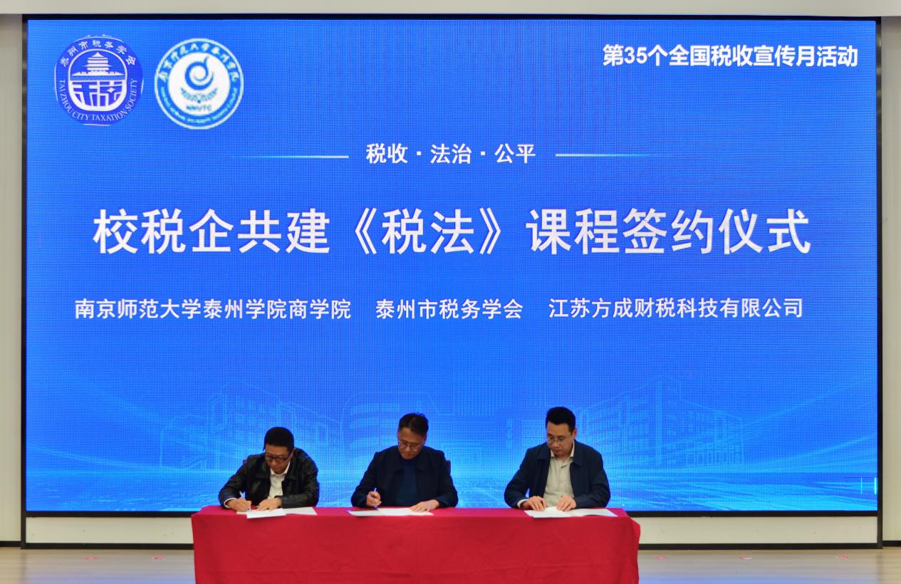 南京师范大学泰州学院商学院院长、泰州市税务学会副会长兼高校分会会长刘尧飞致辞。他表示,本次活动是落实税收宣传、推动税法教育进校园的重要举措,学院将以此次活动为契机,搭建校税企合作平台,引导青年学子知税法、学税法、守税法,培养兼具专业素养与社会责任感的新时代人才。 泰州市税务学会会长王平生在致辞中指出,税收关乎国计民生,加强青少年税法教育意义深远。学会将持续深化与高校、企业的合作,推动税法知识融入校园、融入课堂,为培养财税领域后备力量贡献力量。 在全场见证下,校税企代表共同上台,正式启动青春“税”月・税收进校园活动。随后,商学院辅导员李瑞丹详细介绍税收宣传月系列活动方案,税收宣传志愿者代表高吴月发言,承诺将以实际行动传播税法知识,争做税法宣传的践行者与推动者。 启动仪式后,举行校税企课程共建仪式。泰州市税务学会、企业与学校三方签署《税法》课程共建协议。