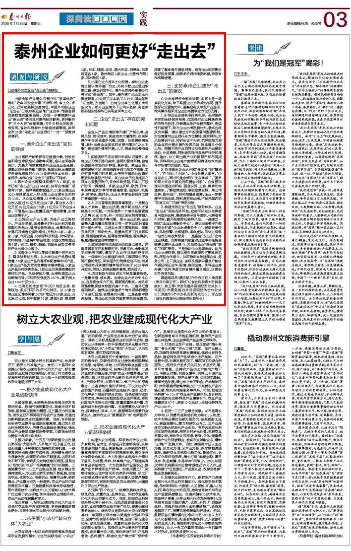 当前全球产业链供应链正从“效率优先”转向“效率与安全并重”的新阶段,本土化、多元化、近岸化趋势加速演进,中国外向型企业“走出去”已成为顺应全球产业变革、增强自身发展韧性的重要选择。为进一步掌握泰州企业“走出去”情况及对泰州经济影响,更好服务于“三个大抓”战略部署,市外办联合发改委、商务局、省社科院泰州分院组成课题组,抽取全市21家“走出去”企业进行“一对一”深度访谈调研。