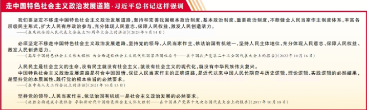 中国特色社会主义政治发展道路的优越性,让我们得以创造经济快速发展和社会长期稳定两大奇迹。在新的历史起点上,我们要继续沿着这条正确道路阔步前进,为人类政治文明进步贡献中国智慧和中国方案。