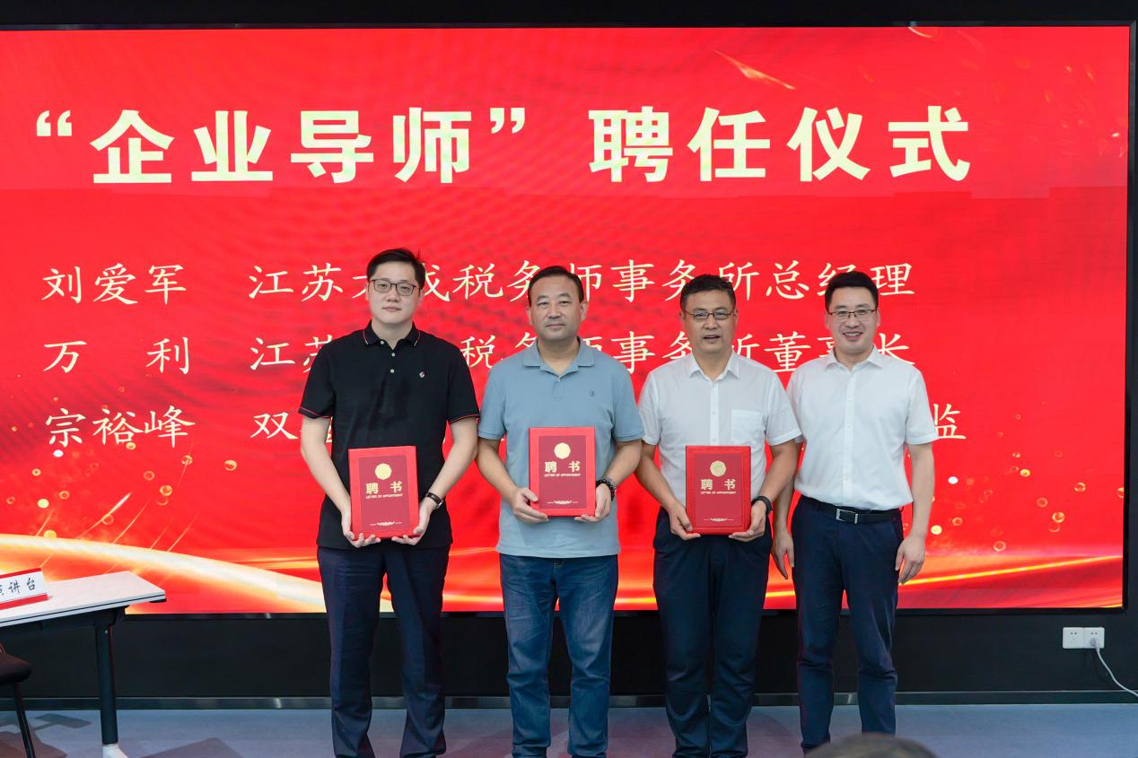 南师大泰州学院,聘任江苏方成税务师事务所总经理刘爱军、江苏瑞泰税务师事务所董事长万利、双登集团股份有限公司财务总监宗裕峰三位泰州学会常务理事、行业专家为“企业导师”,并颁发聘书。